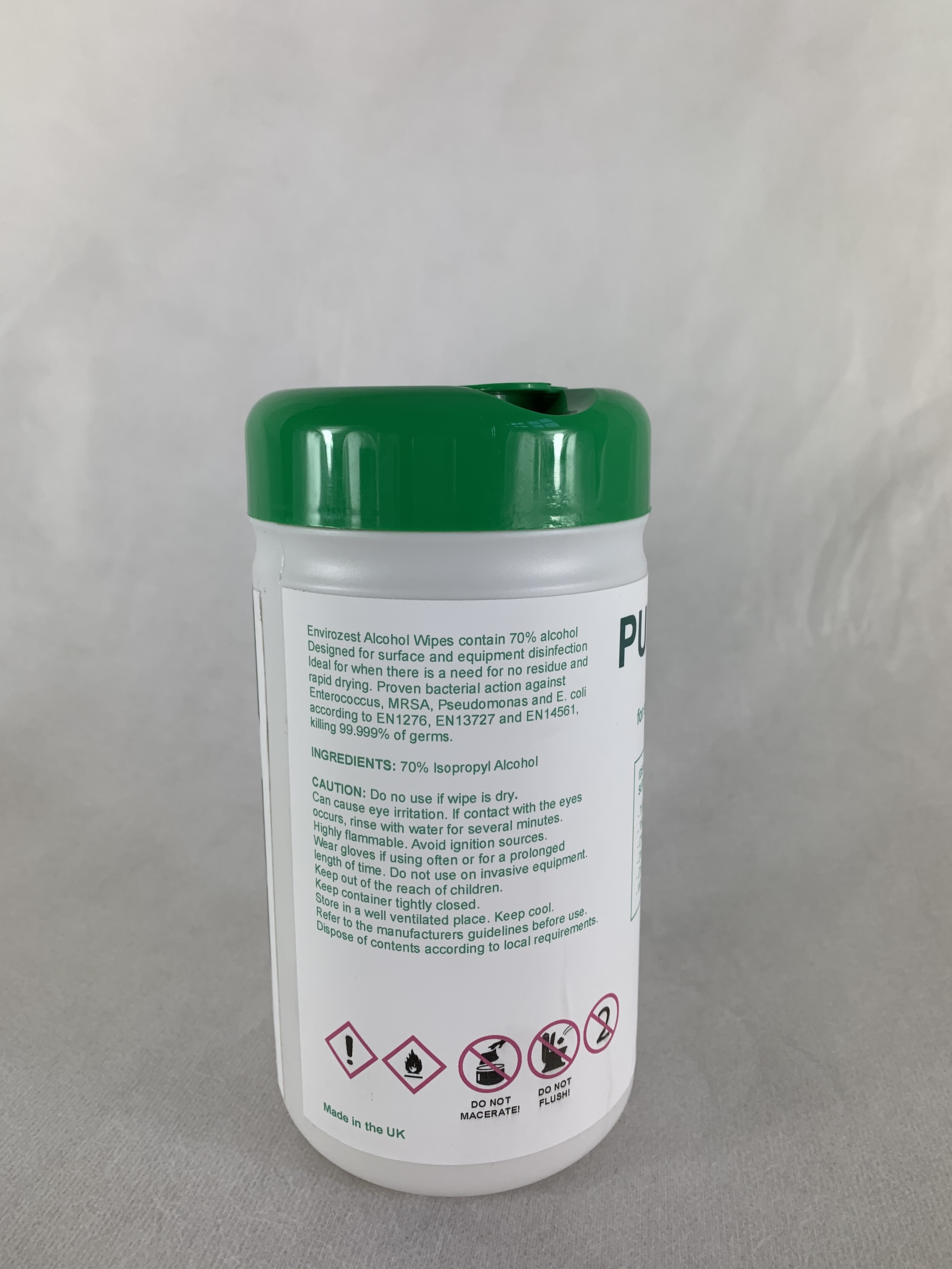 Pure IPA Alcohol Wipes are impregnated with a solution of 70% Isopropanol Alcohol.